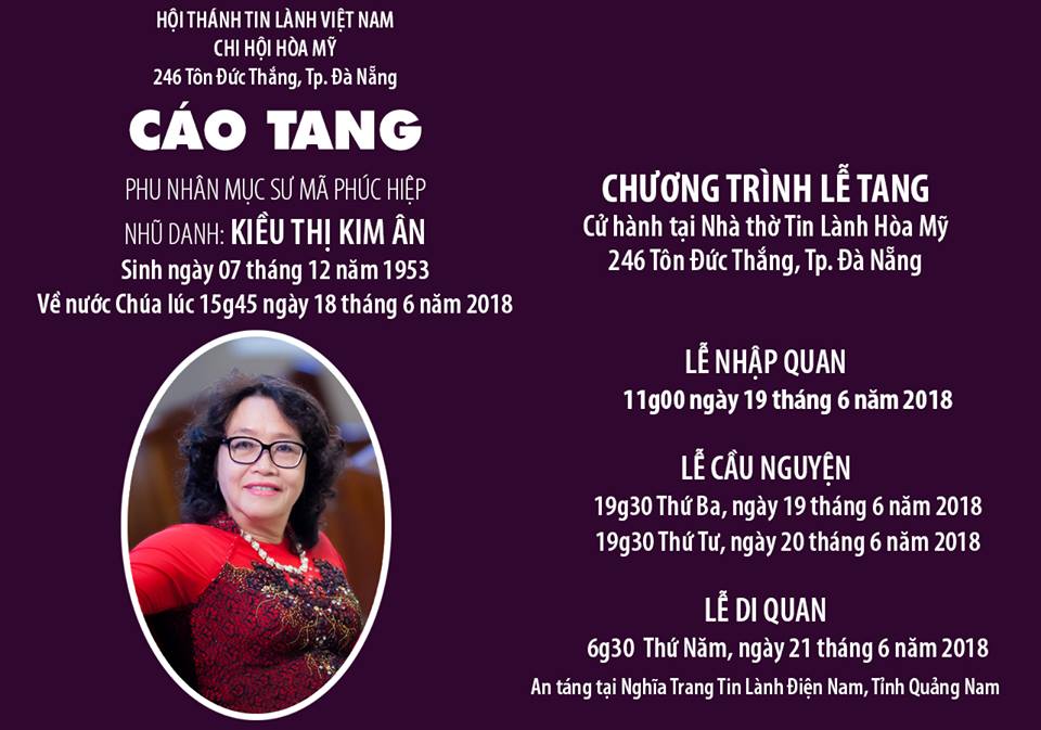 Oneway.vn – Bà Mục sư Mã Phúc Hiệp, nhũ danh Kiều Thị Kim Ân về nước Chúa ngày 18/6/2018, tại Đà Nẵng. Linh cửu đặt tại nhà thờ Tin Lành Hòa Mỹ (số 246 Tôn Đức Thắng, Q.Liên Chiểu, Đà Nẵng).