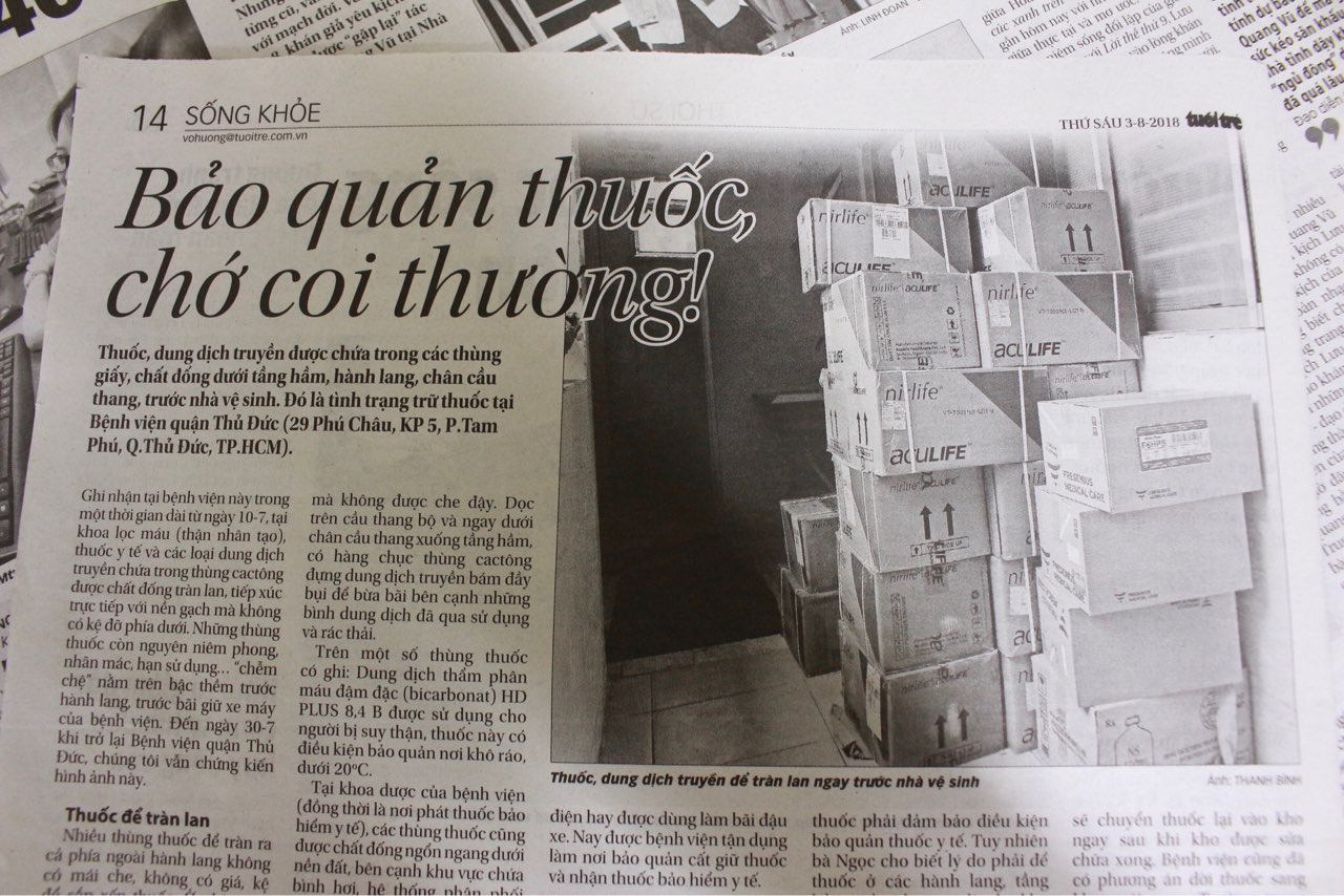 Theo ghi nhận của tờ báo, tại bệnh viện quận Thủ Đức nhiều thùng thuốc để tràn lan ra cả hành lang không mái che, không giá kệ, để trên nền gạch, cạnh các bao rác thải y tế, tủ đồ bệnh nhân và nhân viên mà không được che đậy…