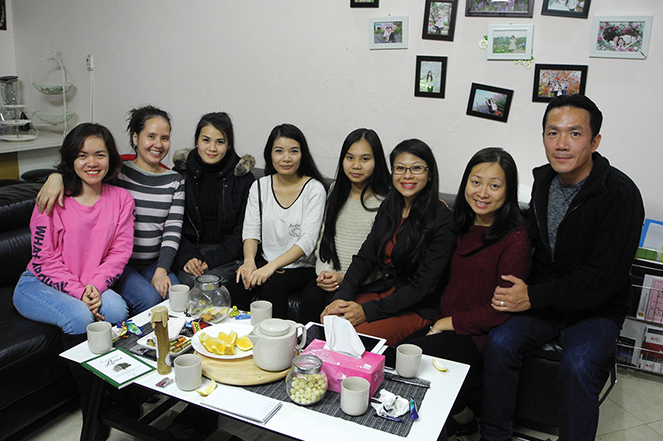 Từ phải sang: Ông bà Mục sư Nam Quốc Trung; Huỳnh Thị Kim Loan; 3 phụ nữ ở trung tâm cai nghiện; và 2 tín hữu trong Hội Thánh. Ảnh: June Cheng