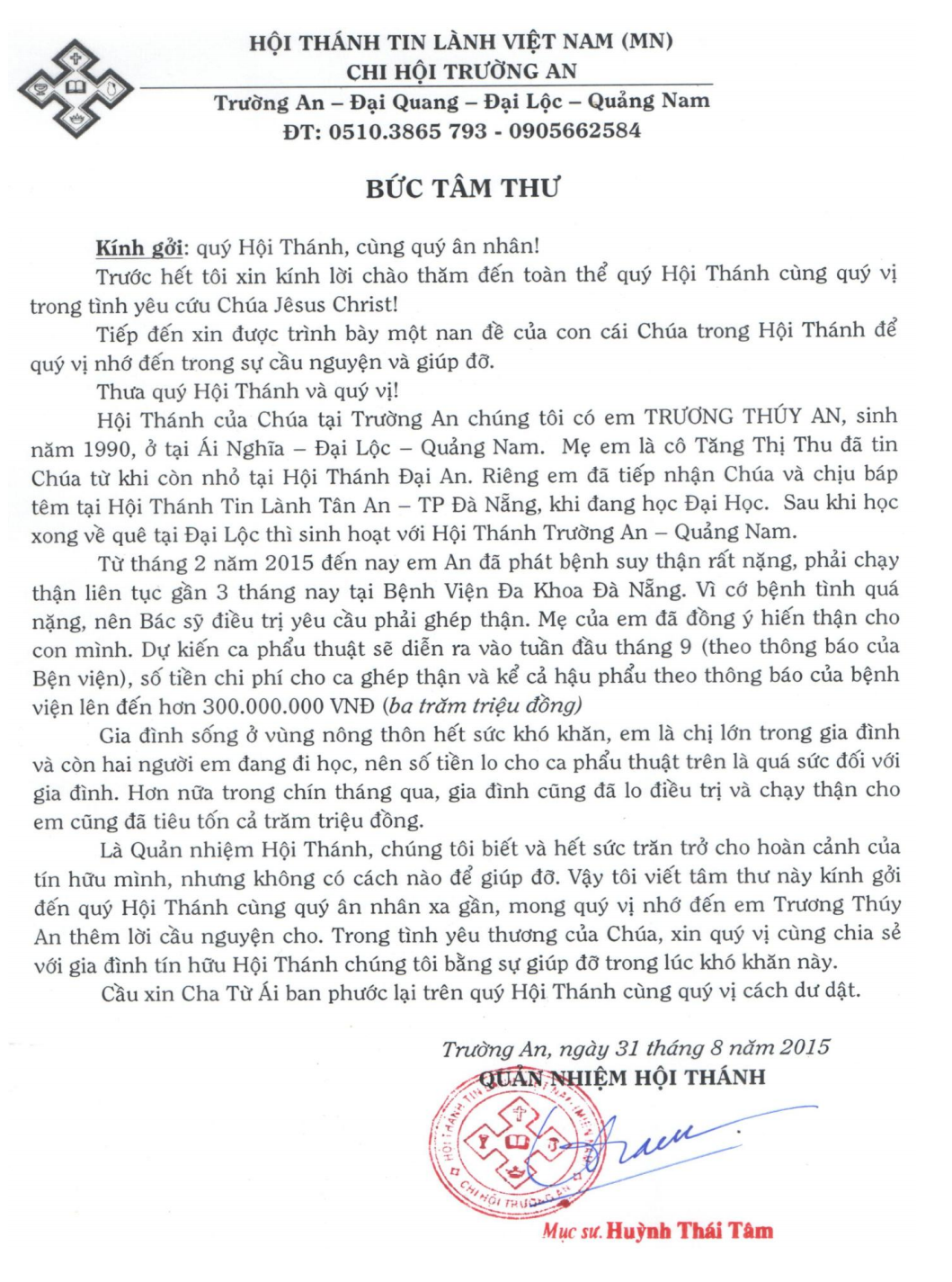 2. Hoặc gởi qua Mục sư Quản nhiệm HT: (ĐT: 0905.662.584)