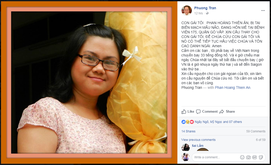 Cập nhật từ anh chị em NTC Saigon: Thiên Ân đã yên nghỉ trong Chúa. Cảm ơn quý con cái Chúa xa gần đã dốc lòng cầu nguyện. Xin cũng hãy tiếp tục cầu thay cho gia đình…