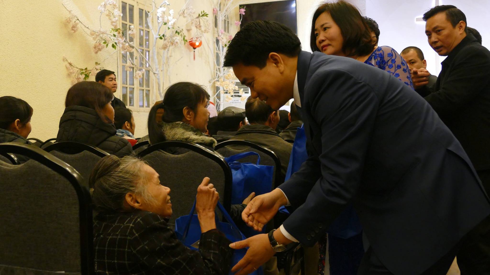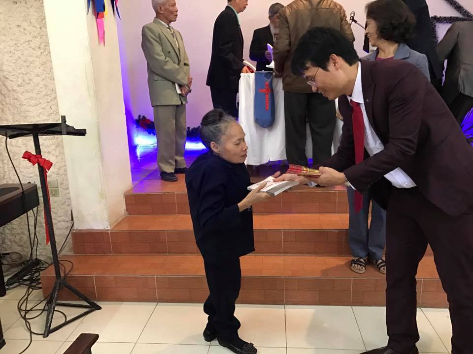 Chủ tịch UBND TP Hà Nội – ông Nguyễn Đức Chung – tặng quà cho ‘Cơ Đốc nhân có hoàn cảnh khó khăn’ Nguyễn Thị Sâm nhân dịp Giáng Sinh 2017 tại HT Hà Nội.