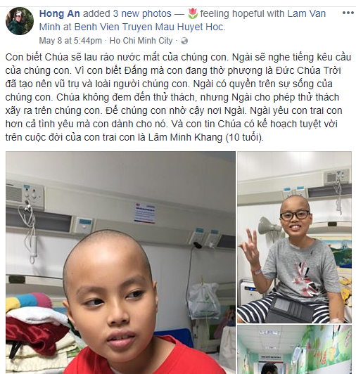 Oneway.vn – Cháu Lâm Minh Khang, 10 tuổi, con trai đầu của anh Lâm Văn Minh và chị Lê Thị Hồng Ân – tín hữu HTTL Hòa Hưng, Q.10, TP.HCM vừa bị chẩn đoán ung thư máu ngày 3/5/2018, và đang được điều trị tại bệnh viện Truyền máu Huyết học, TP.HCM.
