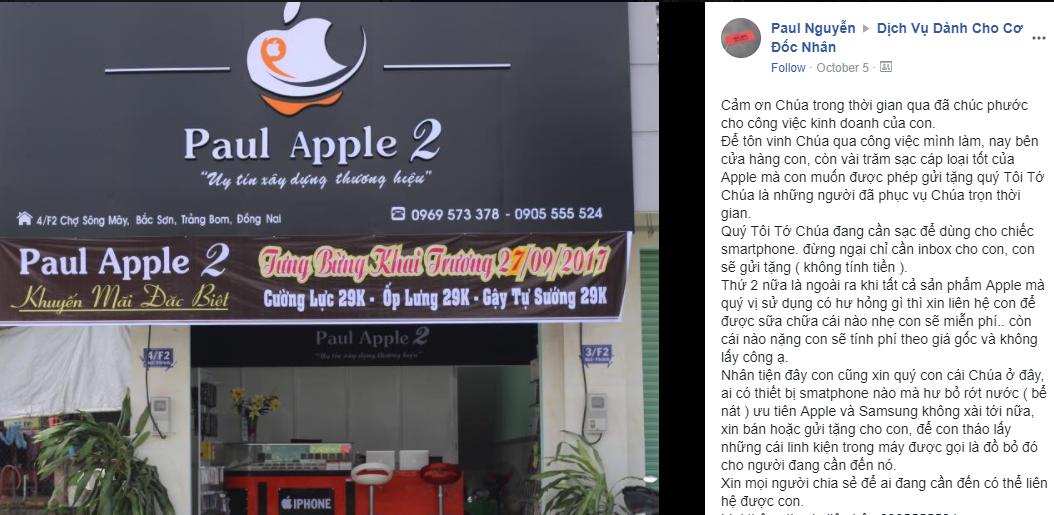 “Nhằm hỗ trợ quý con cái Chúa, trên hết là truyền bá danh Ngài. Cảm ơn Chúa đã ban phước cho công việc kinh doanh của con. Để tôn vinh Chúa qua những việc mình làm, cửa hàng hiện có 100 đồ sạc điện thoại loại tốt của Apple, muốn gởi tặng quý đầy tớ Chúa – những người hầu việc Chúa trọn thời gian. Ngoài ra, các sản phẩm Apple mà con cái Chúa đang sử dụng, nếu có hư hỏng, xin liên hệ để được sữa chữa. Hư hỏng nhẹ: miễn phí; nặng: được tính giá gốc, miễn công!”.