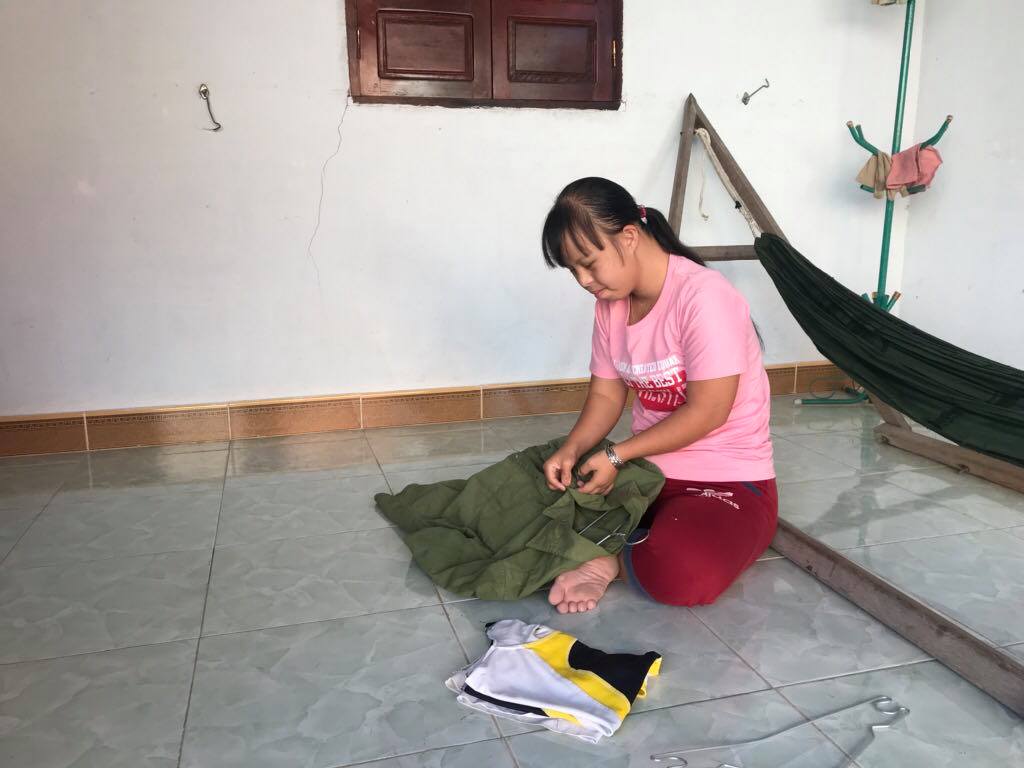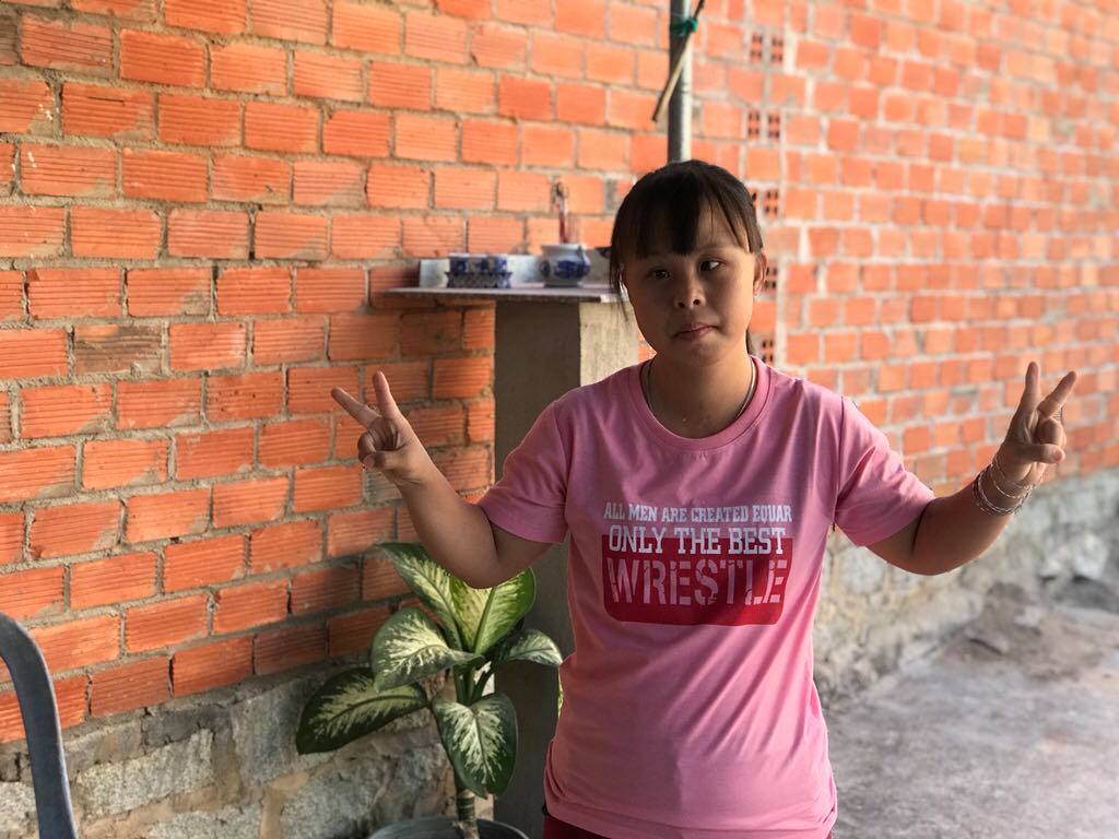 Gấp nhanh cái áo còn dang dở, Yến chạy đến tay bắt mặt mừng mời chúng tôi vào nhà. Thấy có ghi hình, Yến đến “góc đẹp nhất ngoài sân” – theo lời cô Chung – giơ hai tay làm dáng vô cùng “điệu nghệ”. Nhìn dáng vẻ hồn nhiên của con gái, cô Chung cười: “Yến thích chụp hình lắm, ở đâu có chụp hình là làm dáng ngay!”.