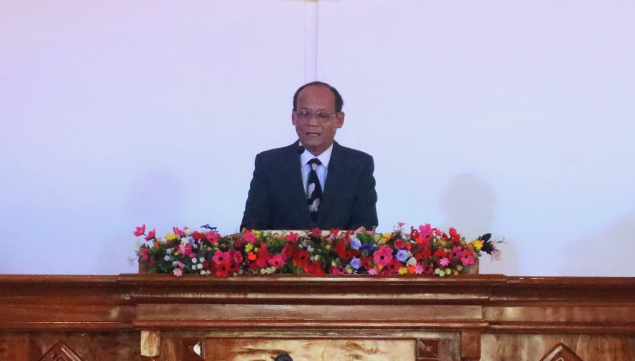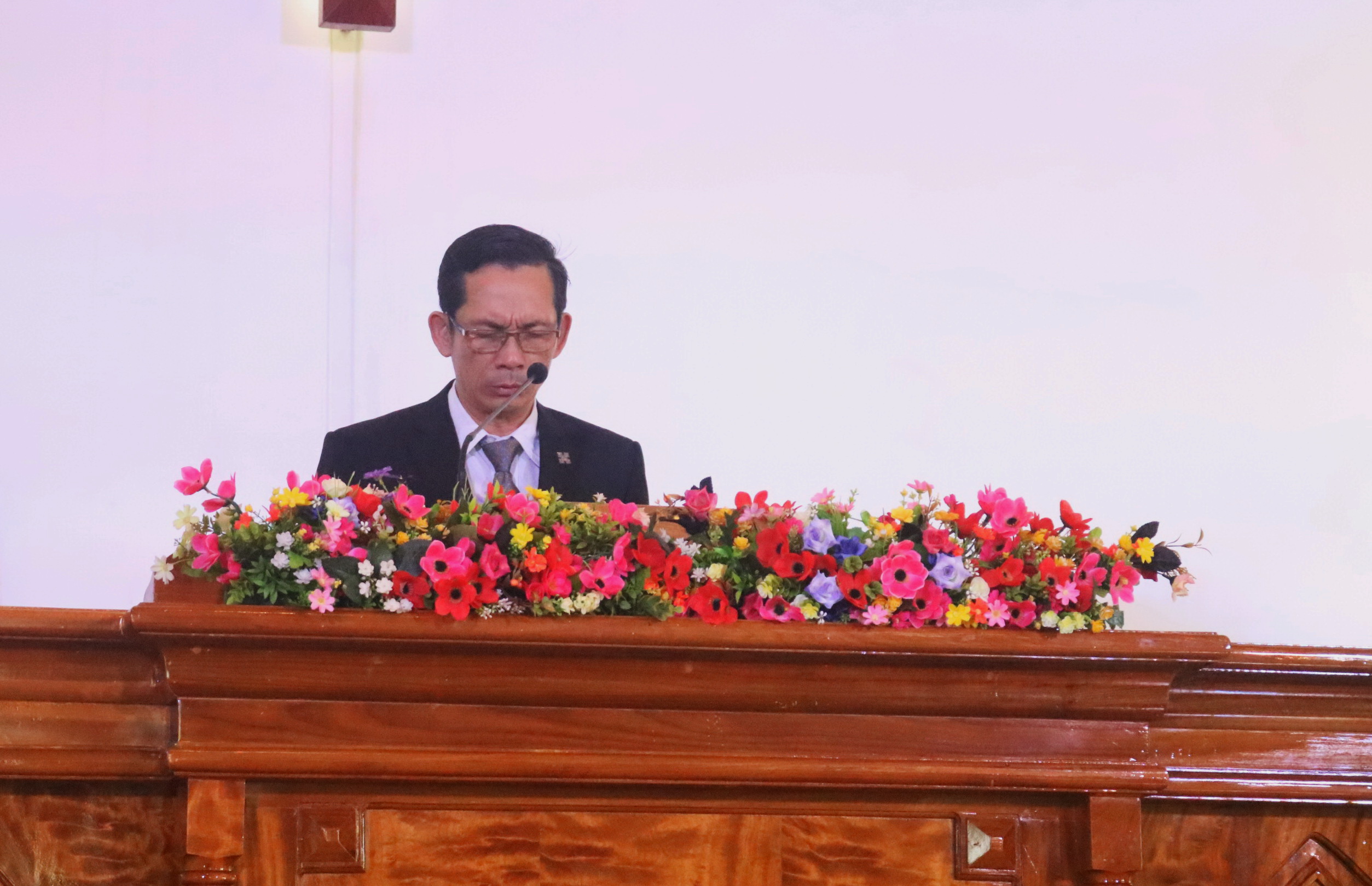 Mục sư Trần Đình – Trưởng ban Đại diện Tin Lành tỉnh Quảng Nam – chào mừng và cầu nguyện dâng 2 ngày Hội thảo lên cho Chúa.