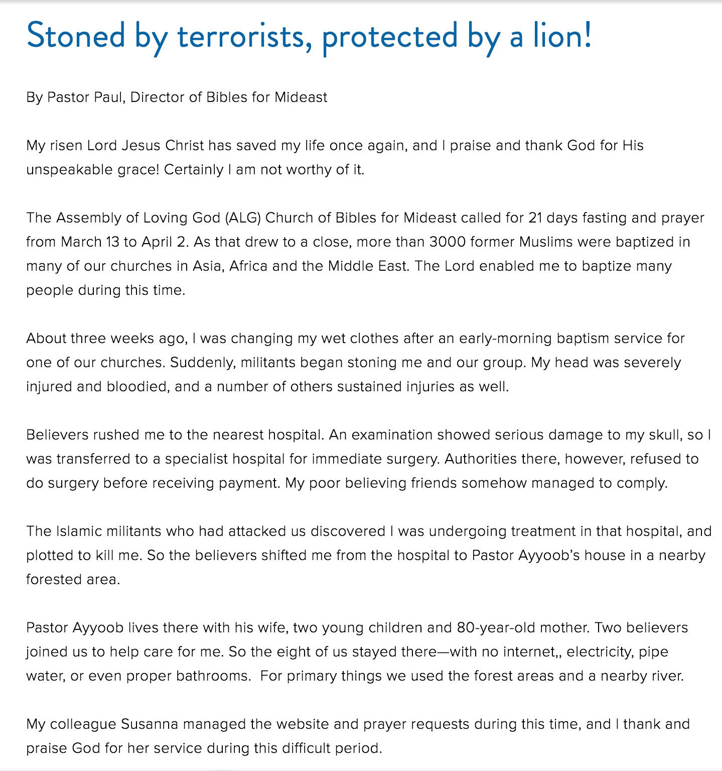 Bài làm chứng của Paul trên trang web mục vụ Bibles for Mideast của ông.