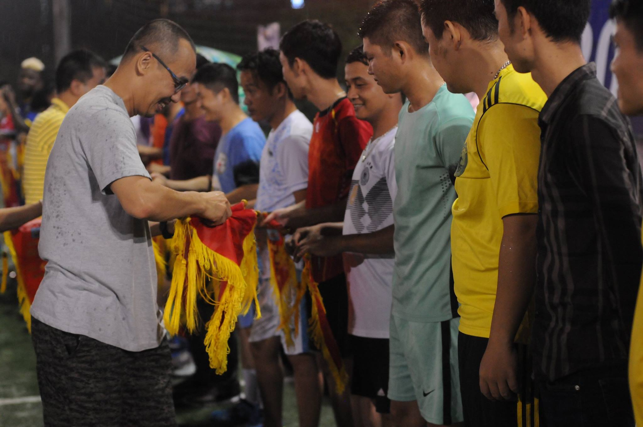 Mục sư Bùi Quốc Phong trao cờ lưu niệm cho các đội bóng tham dự.