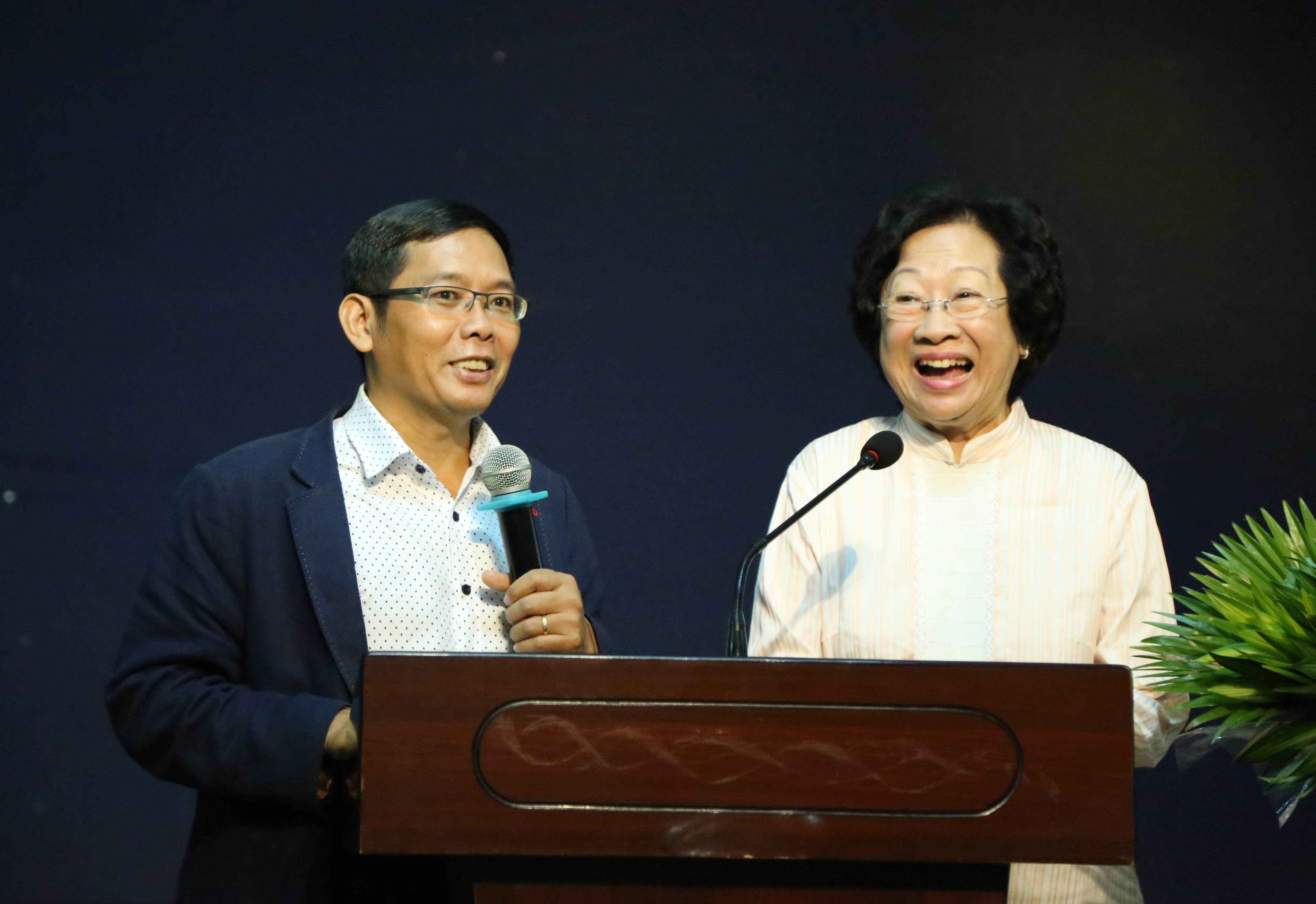 Mục sư Ngô Minh Hòa (trái) thông dịch một buổi giao lưu và giới thiệu sách.