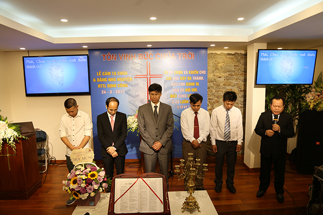 Mục sư Bùi Văn Sản – Phó Hội trưởng thứ Nhất cầu nguyện cho Mục sư quản nhiệm, chấp sự Hội thánh và dâng nhà nguyện mới lên cho Chúa