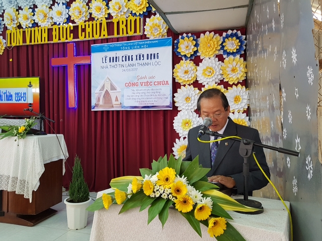Mục sư Lê Hoàng Phúc giảng luận với đề tài: “Gánh vác công việc Chúa” dựa trên nền tảng Kinh Thánh Nê-hê-mi 2:17-3:12 để nhắc nhở tôi con Chúa tinh thần cùng nhau chăm lo công việc Chúa. Tiếp theo, Mục sư chủ lễ tiến hành nghi thức lễ khởi công, đọc các văn bản liên quan, giới thiệu Ban Xây dựng cho Hội Thánh được biết và cầu nguyện đặc biệt cho việc xây dựng nhà Chúa.