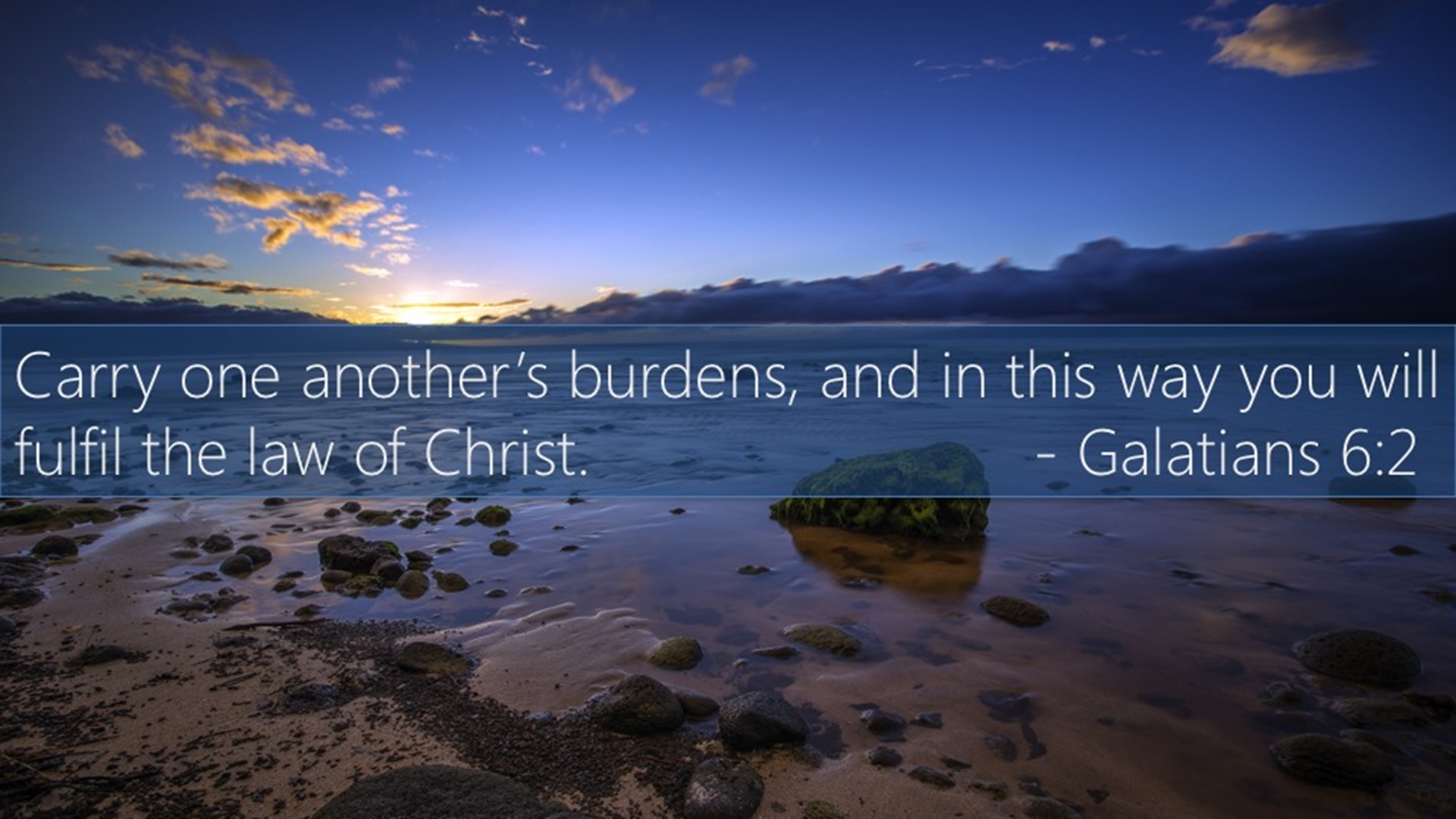 Câu 2 khẳng định nguyên tắc cơ bản như một mệnh lệnh – “Hãy mang gánh nặng cho nhau”. Rõ ràng, mệnh lệnh này áp dụng cho tất cả các gánh, chứ không riêng gì gánh của người đang vấp ngã. Khi Paul/Phao-lô dạy rằng việc mang gánh cho nhau là “làm trọn luật pháp của Đấng Christ” ông nói rõ ông đang xem xét toàn bộ luật đạo đức. Mọi hành động thương xót, hy sinh vì lợi ích của anh em, là một phương tiện thực tế bày tỏ tình yêu của Đấng Christ, bởi đó chúng ta làm trọn các yêu cầu đạo đức trong luật pháp của Ngài.