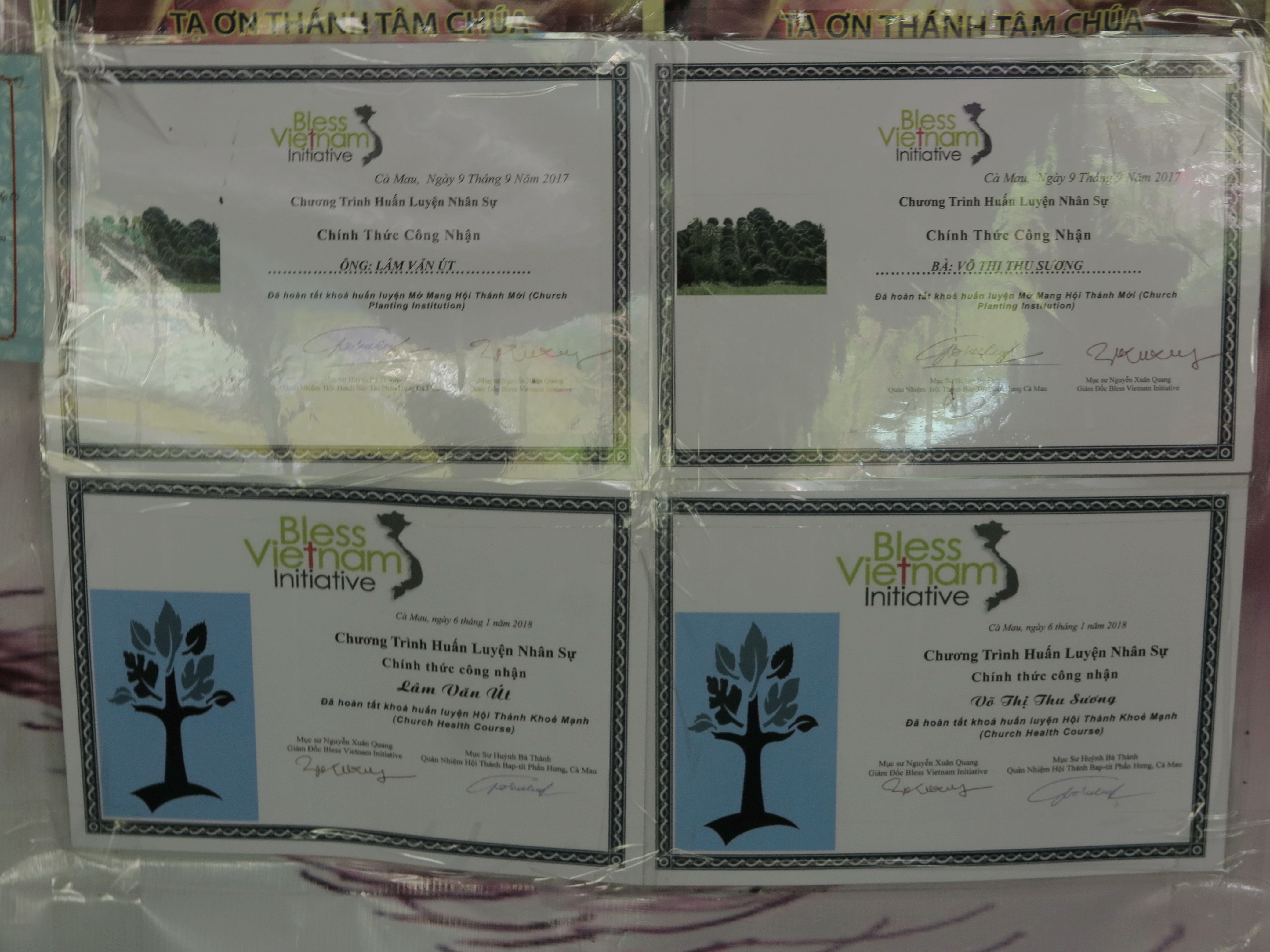 Một trong nhiều Chứng nhận tốt nghiệp các khóa Huấn luyện nhân sự, lớp học Kinh Thánh…mà ông Út dán trên “tường” nhà.