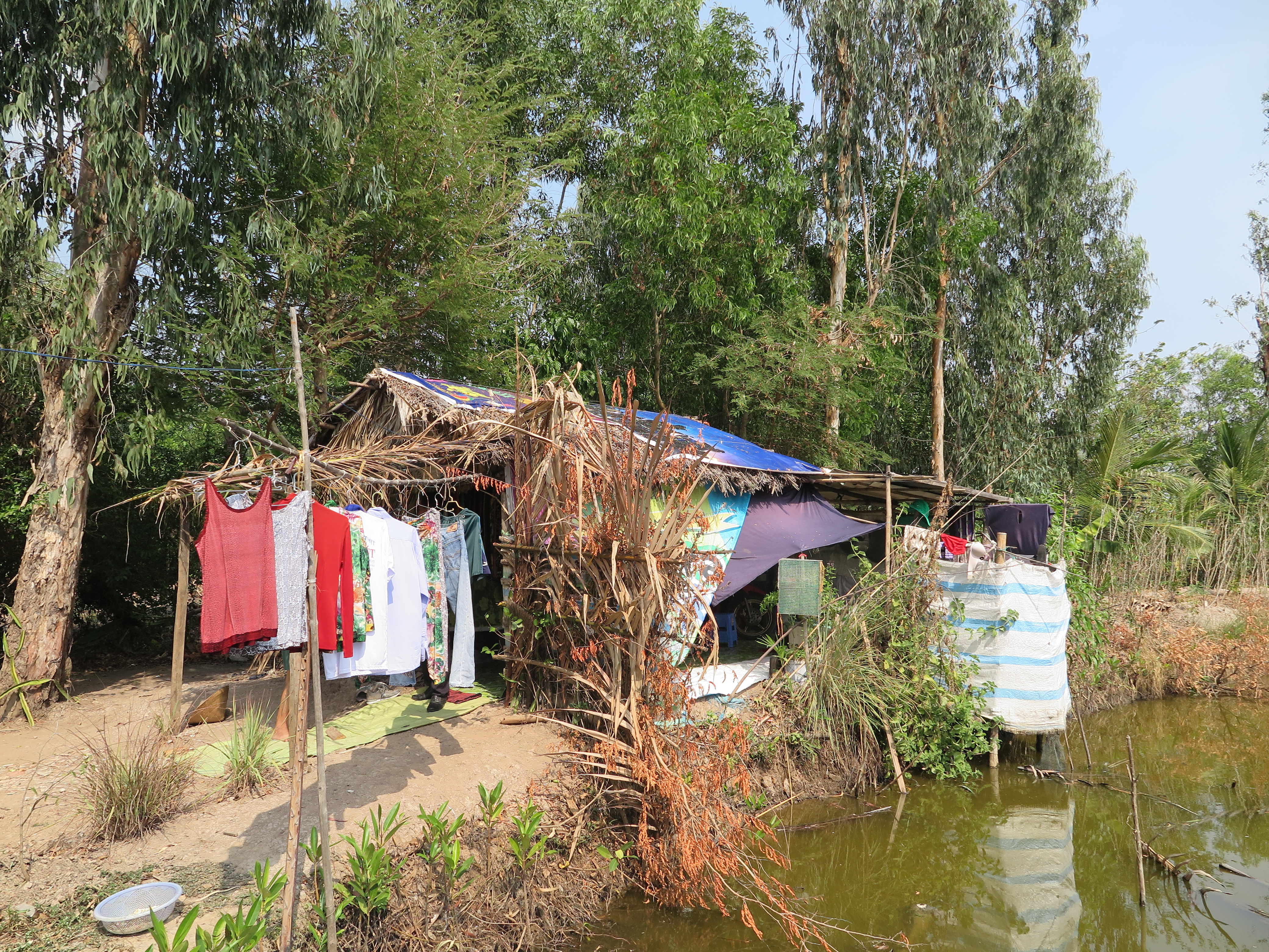 Cái chòi tạm bợ cạnh ao cá – nơi vợ chồng ông Lâm Văn Út đang sống.