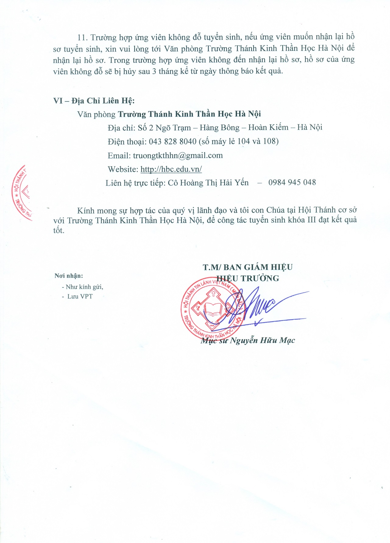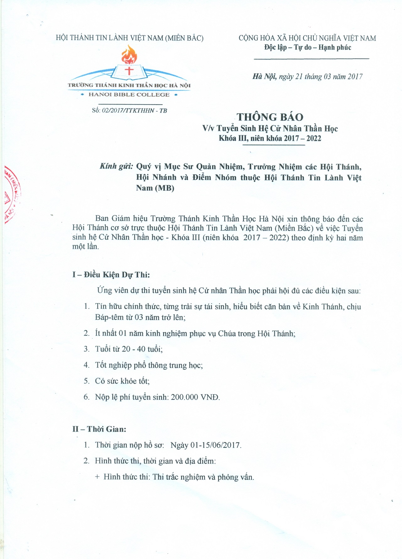 Ban Giám hiệu Trường Thánh Kinh Thần học Hà Nội xin thông báo đến các Hội Thánh cơ sở trực thuộc Hội Thánh Tin Lành Việt Nam (miền Bắc) về việc Tuyển sinh hệ Cử Nhân Thần học – Khóa III (niên khóa 2017 – 2022) theo định kỳ hai năm một lần.