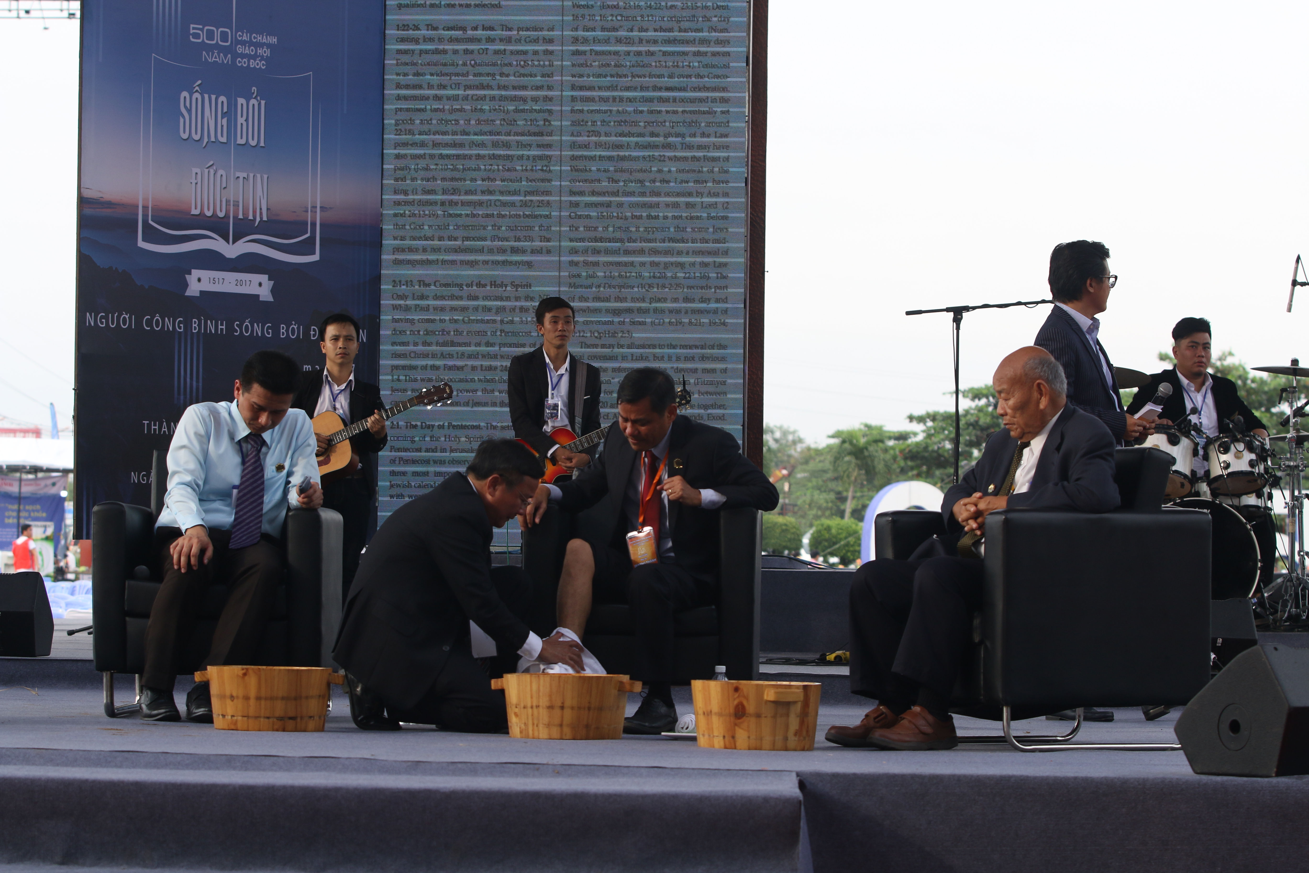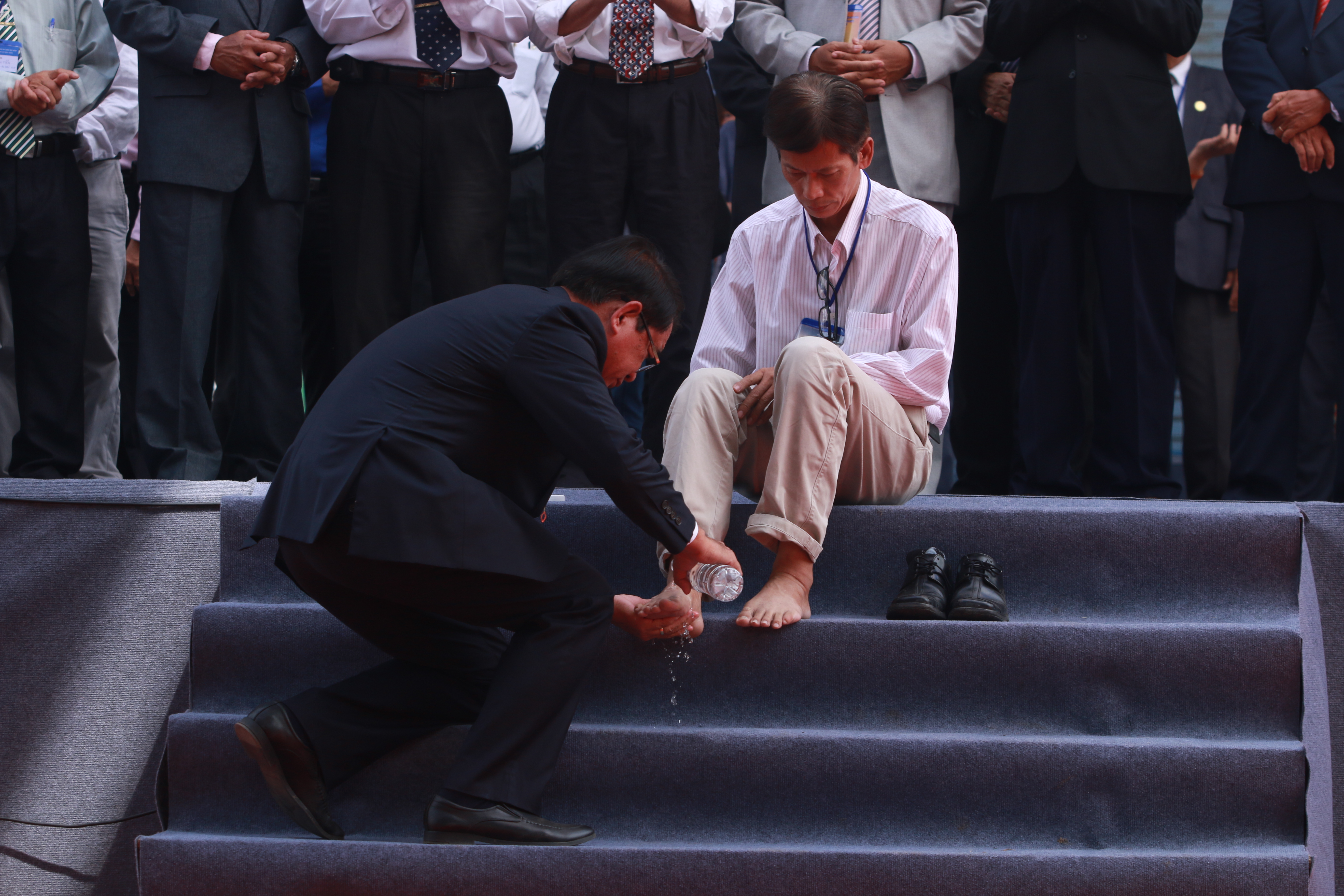 Kế đến, Mục sư Phạm Đình Nhẫn được mời lên sân khấu để u gọi sự tha thứ, sự hiệp nhất trong Chúa và rửa chân cho 3 vị khách mời. Hội chúng tôn vinh Chúa bài Thánh Ca “Kết chúng con làm một”.