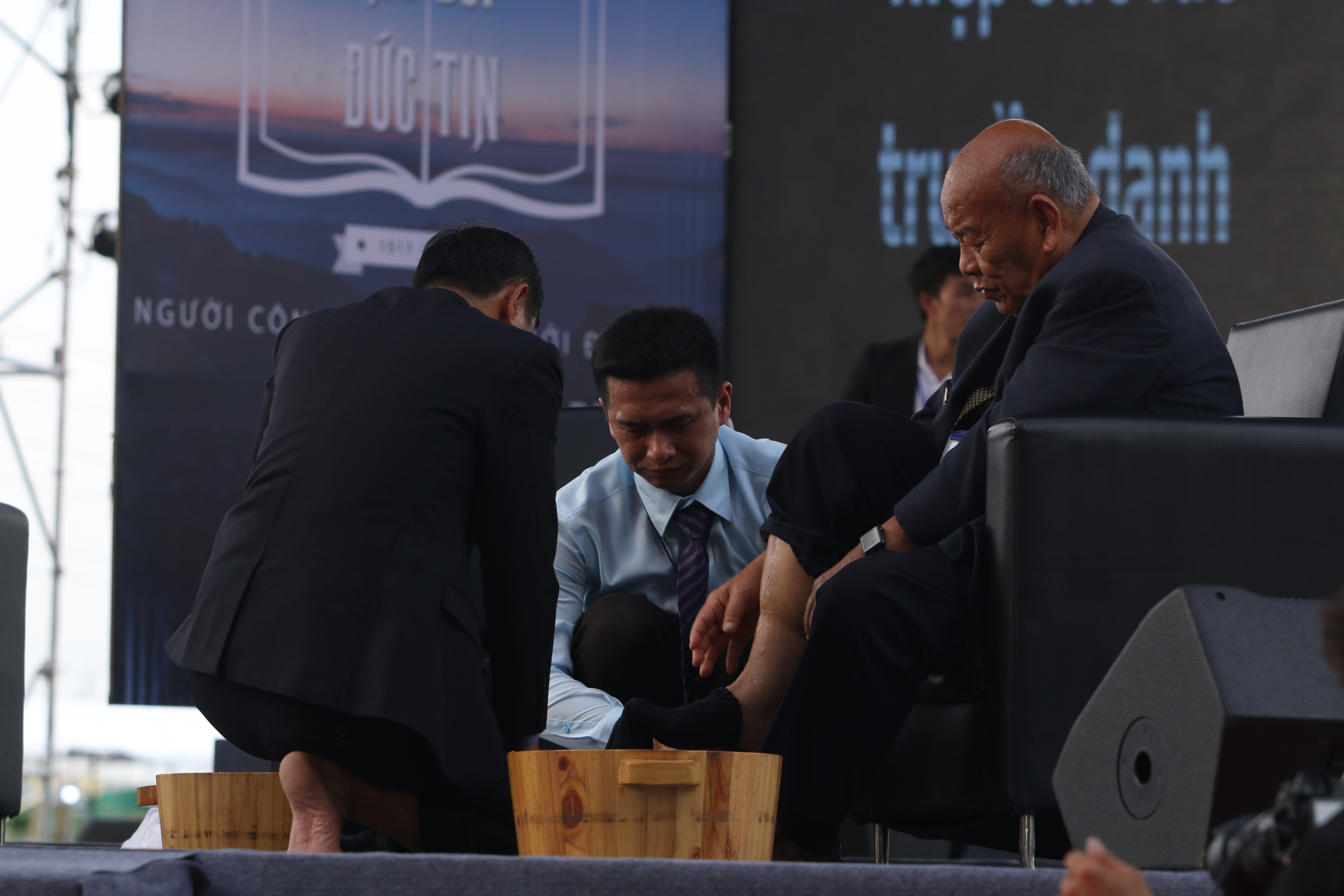 Mục sư Nguyễn Xuân Đức, đại diện cho thế hệ đi trước rửa chân cho Mục sư Nguyễn Thế Trung và Mục sư Dương Thành Lâm – đại diện cho thế hệ đi sau. Hai vị Mục sư cũng đại diện để rửa chân cho thế hệ trước – Mục sư Nguyễn Xuân Đức – bày tỏ gương phục vụ lẫn nhau – rửa chân cho nhau.