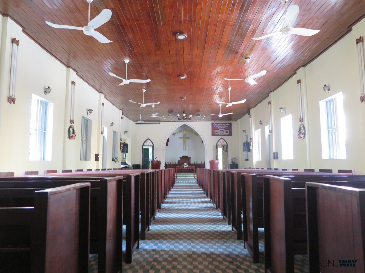 Bên trong nhà thờ Tin Lành Hội An vẫn còn lưu giữ nét cổ xưa với ghế gỗ, la phông gỗ, gạch bông và quạt trần